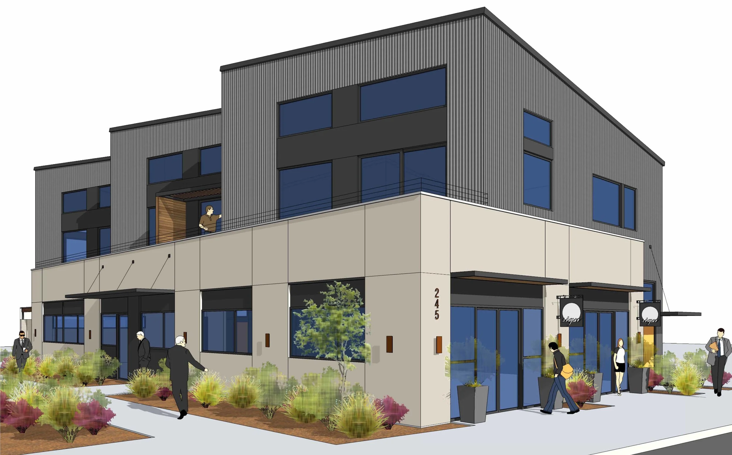 245 Higuera Mixed Use proposes a new two-story building with ground-level, commercial space and two new loft apartments above. The new building is located in the same footprint as the existing metal garage to be removed. The design aims to meet all requirements of the Mid-Higuera Enhancement Plan, providing rhythmic, appropriately scaled storefront bays at the retail ground floor with a plane break and material transition to the upper residential floor. Overhangs and signage are included to enhance horizontal articulation and provide a pedestrian scale at Higuera Street. The upper floor’s shed roof both maximizes solar exposure to the south, and creates height for loft apartments. The rotation of the north wall aims the lofted windows directly at the view of Madonna Mountain.