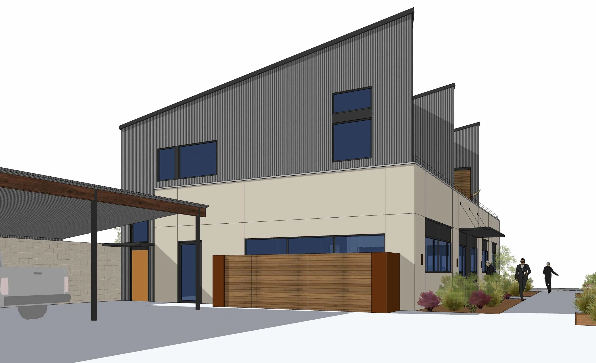 The project aims to eliminate waste by maintaining a portion of the existing CMU wall at the south property line and refurbishing the existing carport that will be engineered to hold up to 930 SF of new solar panels. The new shed roof faces south, at the ideal angle for the additional 875 SF of solar panels. Operable windows are located throughout for natural ventilation. Solar tubes will bring light to the south side of the commercial space. And what is now a 100% paved site will be renovated to include pervious pavers and native landscaping. Overall these measures in addition to energy conscious wall and roof assemblies will reduce the conventional energy demand.