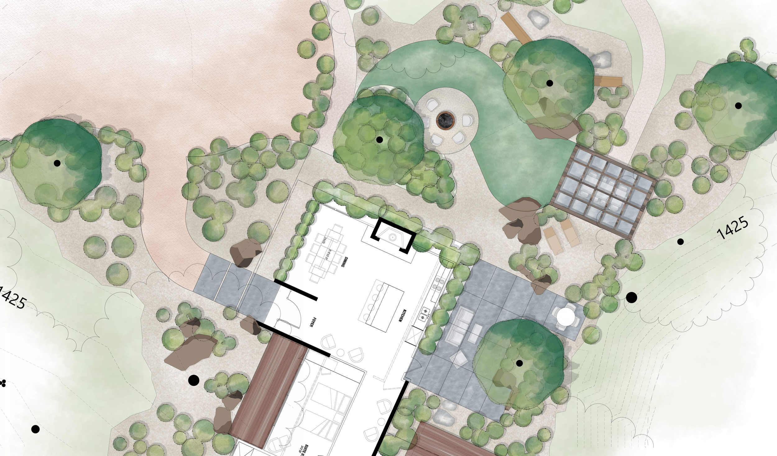 Outdoor rooms are developed based on intimate and social gathering opportunities while reflecting the warm character of the home. The wild context of the site is allowed to interject within the design, developing moments of peacefulness as visitors hear the song of birds and a nearby stream.