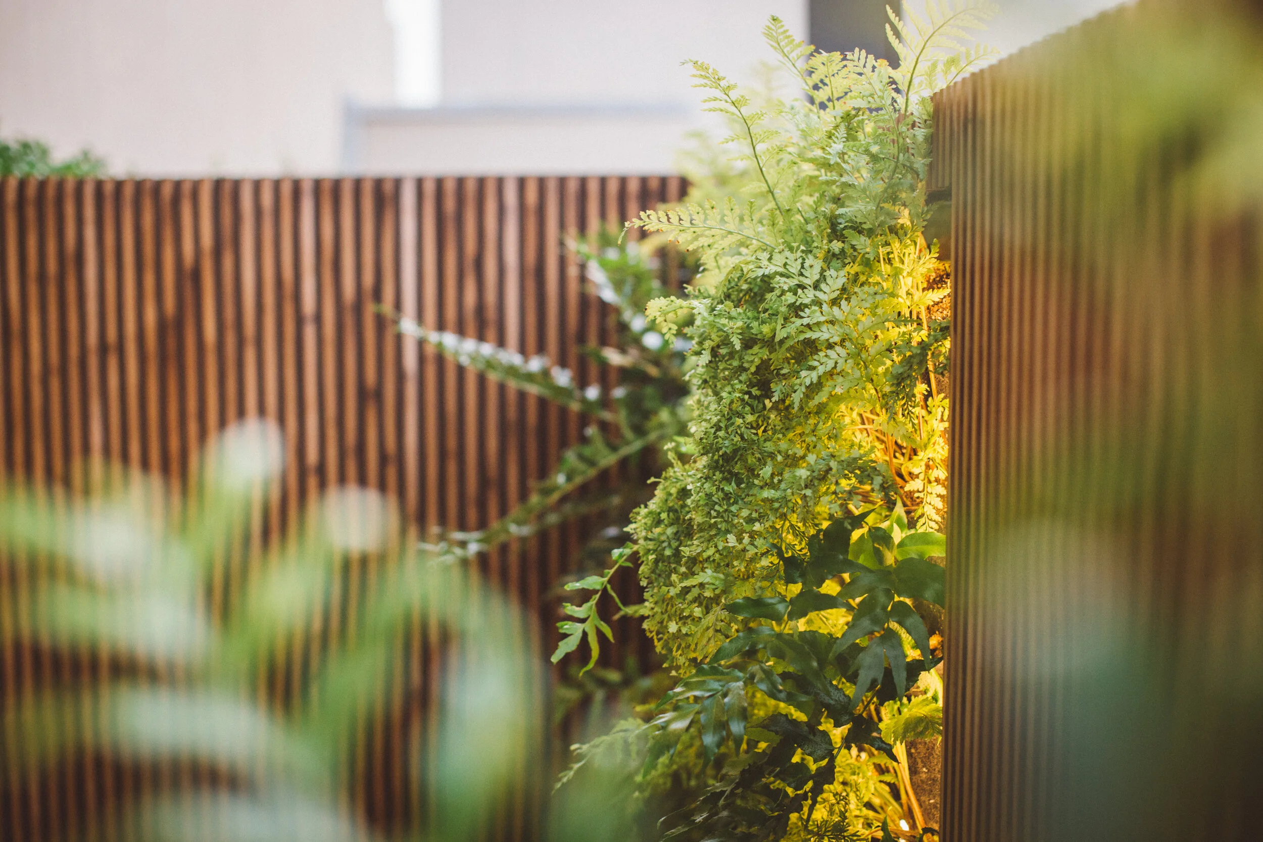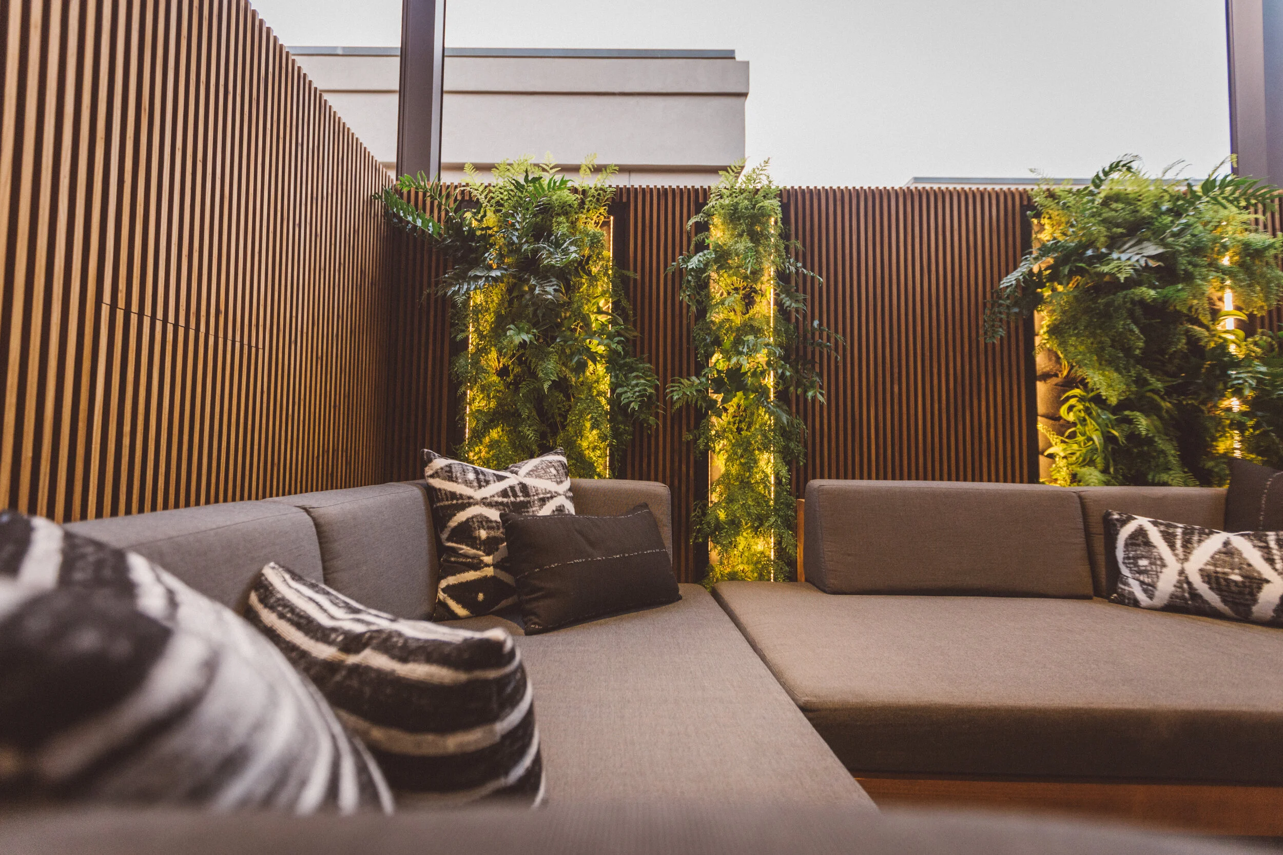 In the heart of San Luis Obispo’s downtown scene, a patio was in desperate need of revisioning into a welcoming space for socializing. The clients desired a contemporary and flexible space that would provide ample shade and compliments of greenery. Existing steel fencing was revisioned into a modern wood screen and living wall panels were carefully integrated to add interest. A powder coat steel pergola ties the ambiance together, integrating lighting and a movable shutter system.