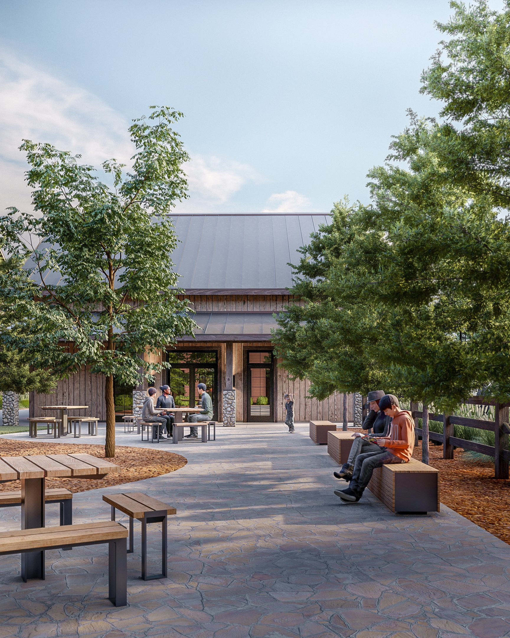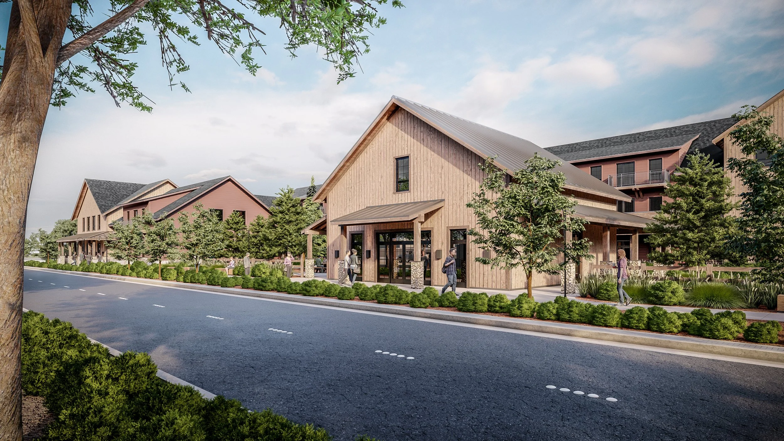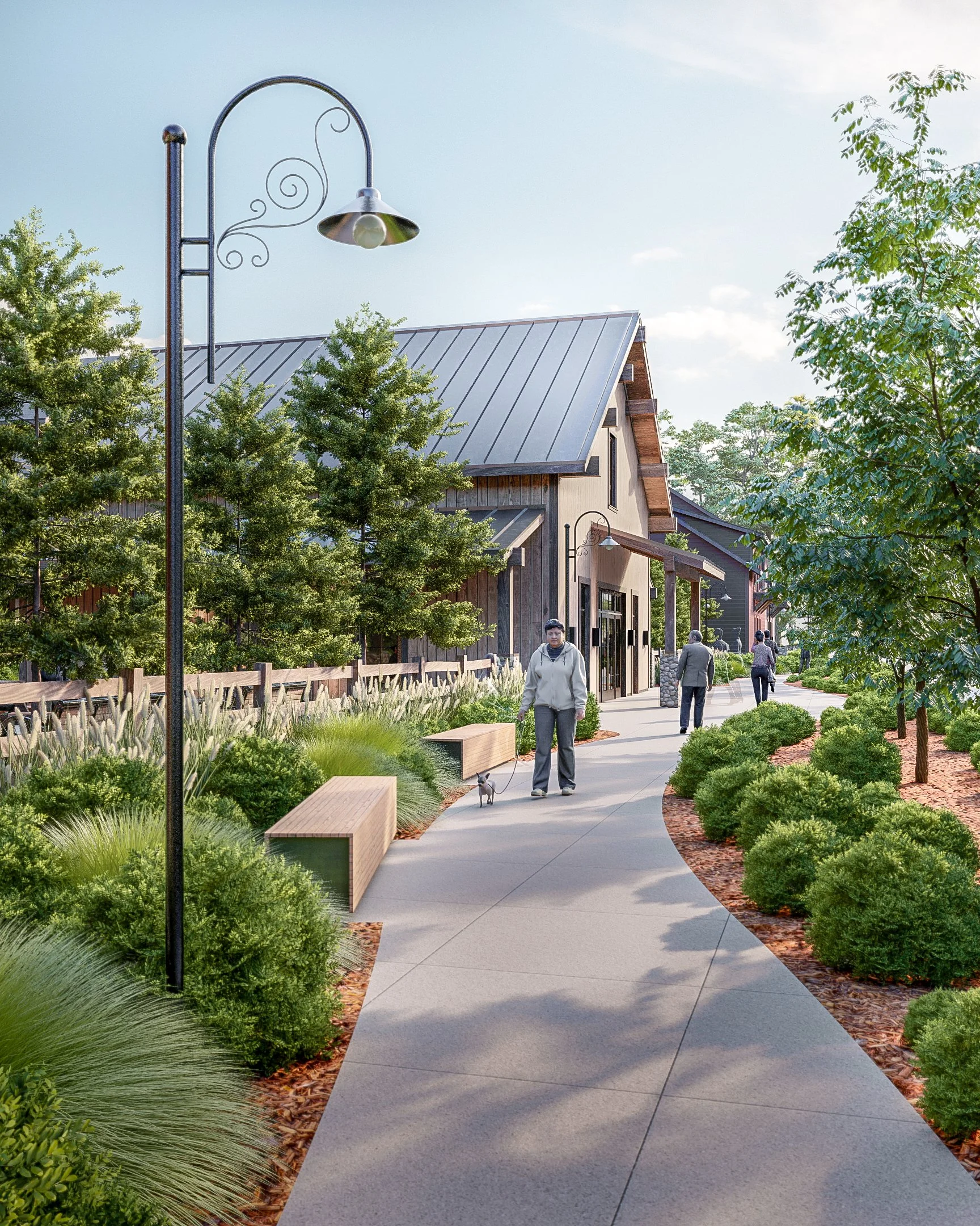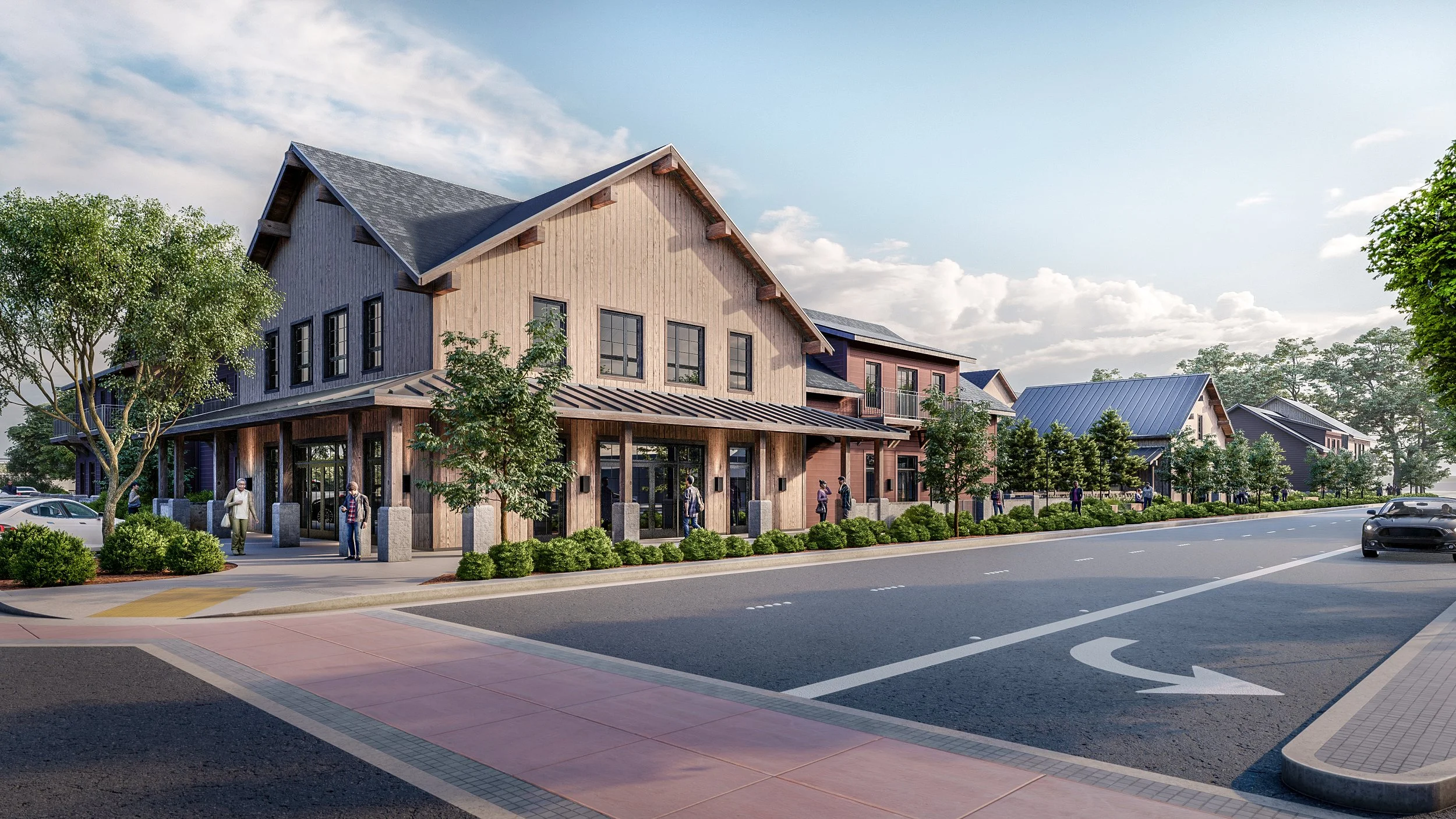 The proposed project embraces varying heights, rooflines, and materials to create village style architecture that transitions to the surrounding one-story buildings. The composition seamlessly enhances the neighborhood emphasizing the community and a feeling of connectiveness.