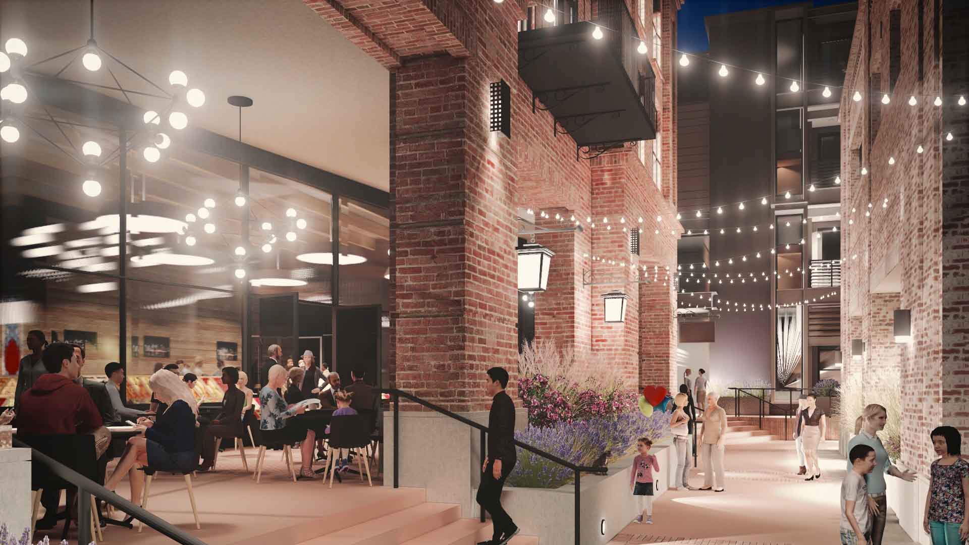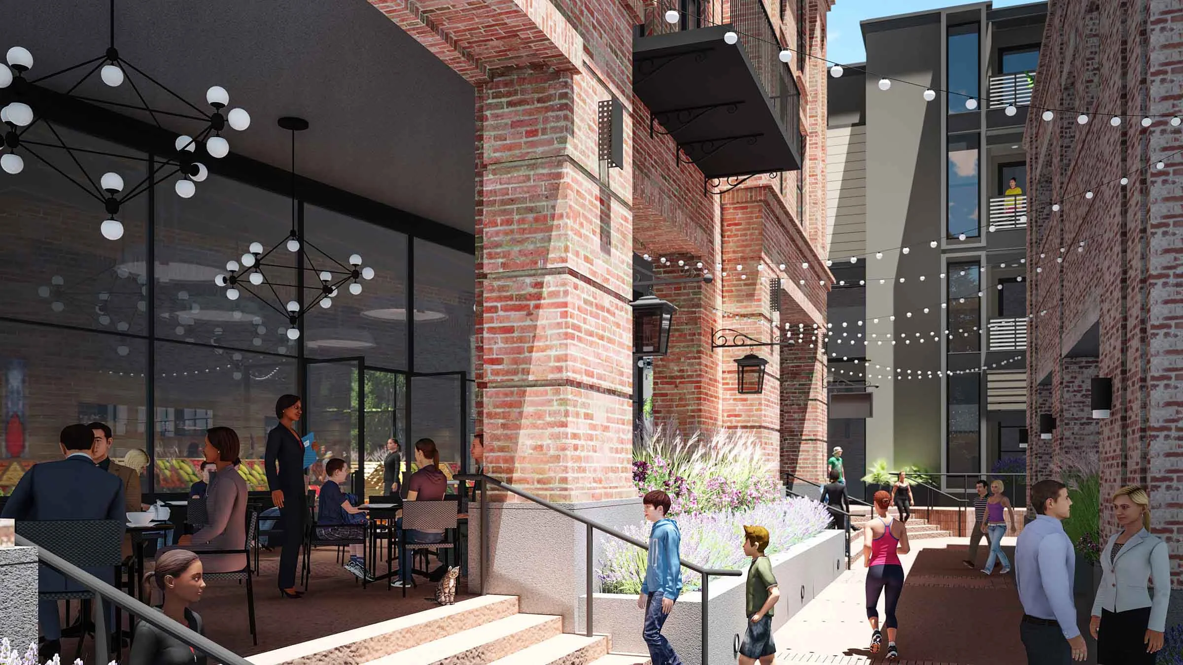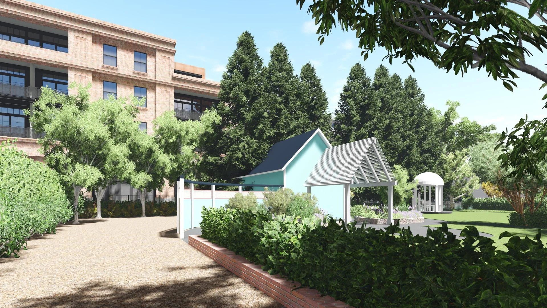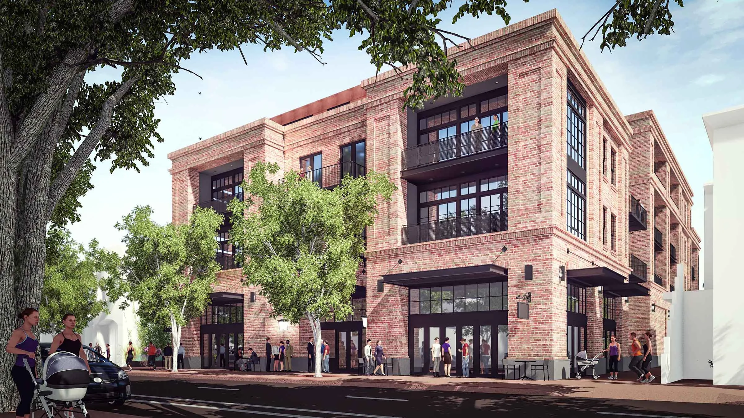 The project proposes retail on the ground floor, with upper-floor residential units, a public plaza and paths, a pedestrian connection between Marsh and Higuera streets, and underground parking. San Luis Square is located next to the historic Jack House, with the closest property line along Marsh Street, about 125 feet away from the structure. The plans include preservation of the redwood trees along the property line.