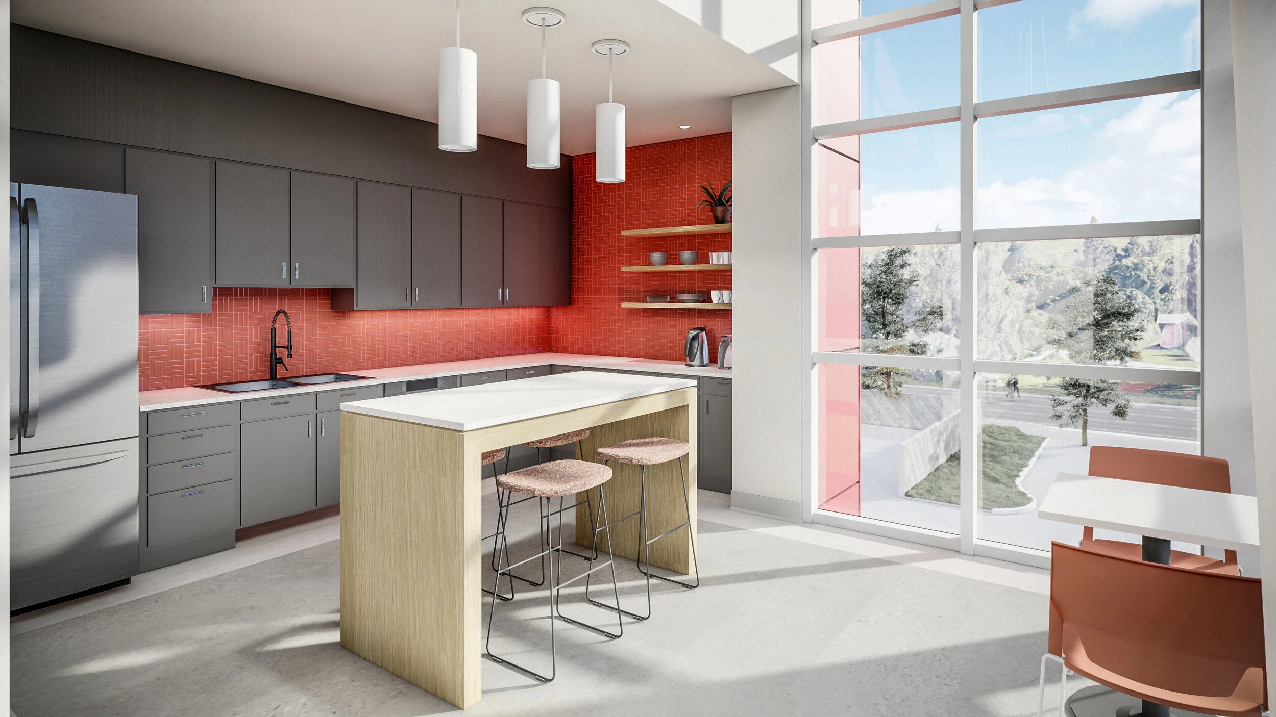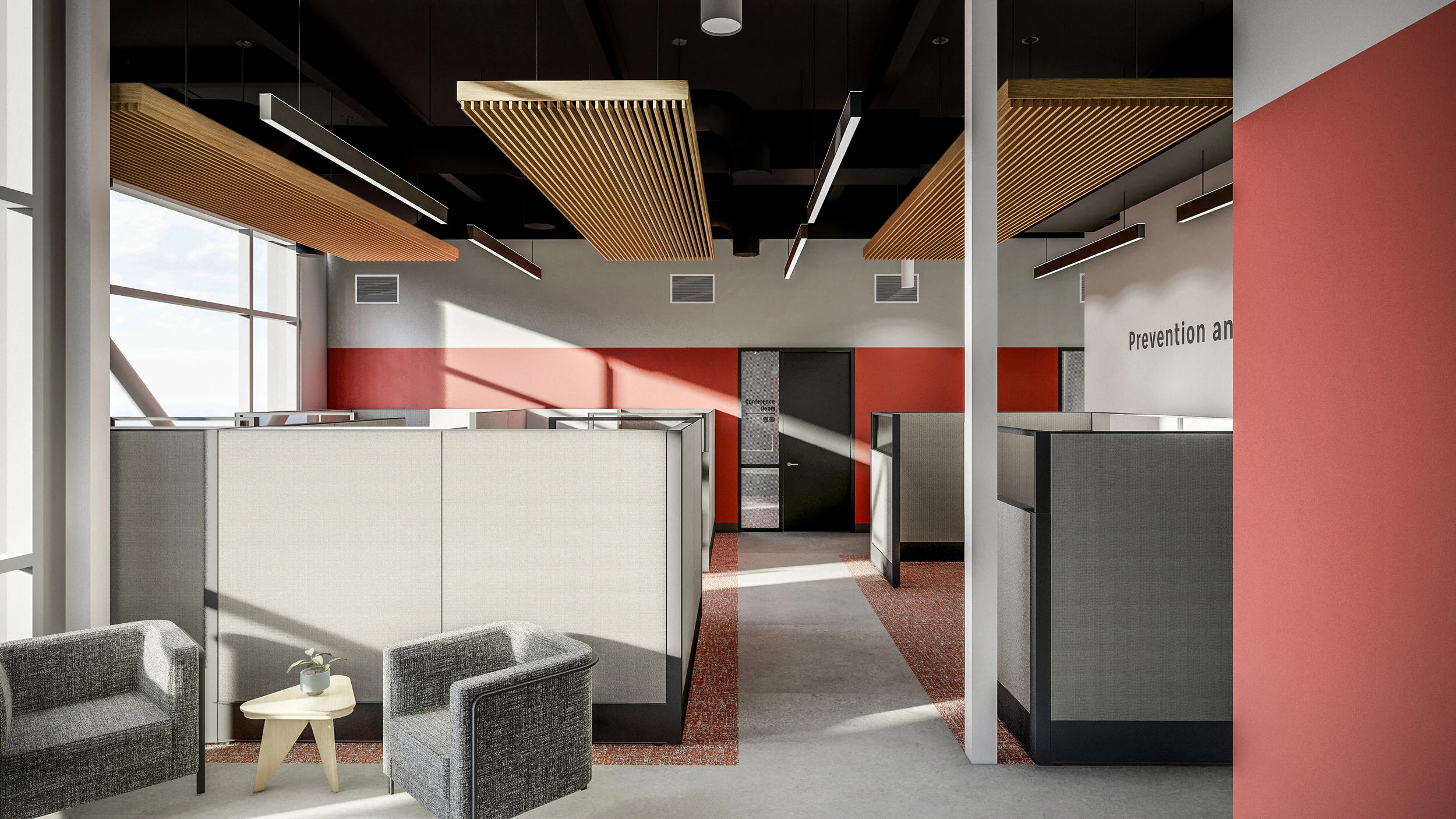 A simple but carefully selected color palette is used at a range of scales in transformative ways to provide clear wayfinding and a subtle but effective emotional connection to each function of the building. Every material, fixture, and design element is selected through a close relationship between architect and builder to be the most eco-friendly version possible, from wall construction down to floor adhesive.