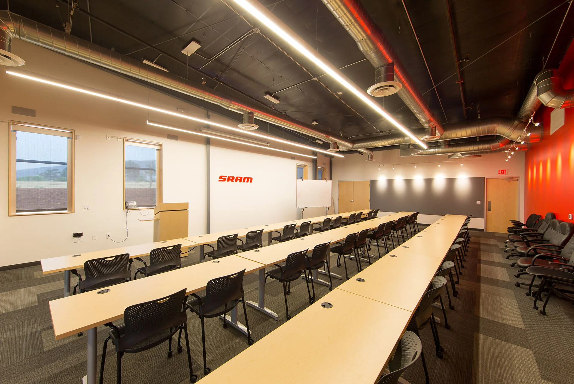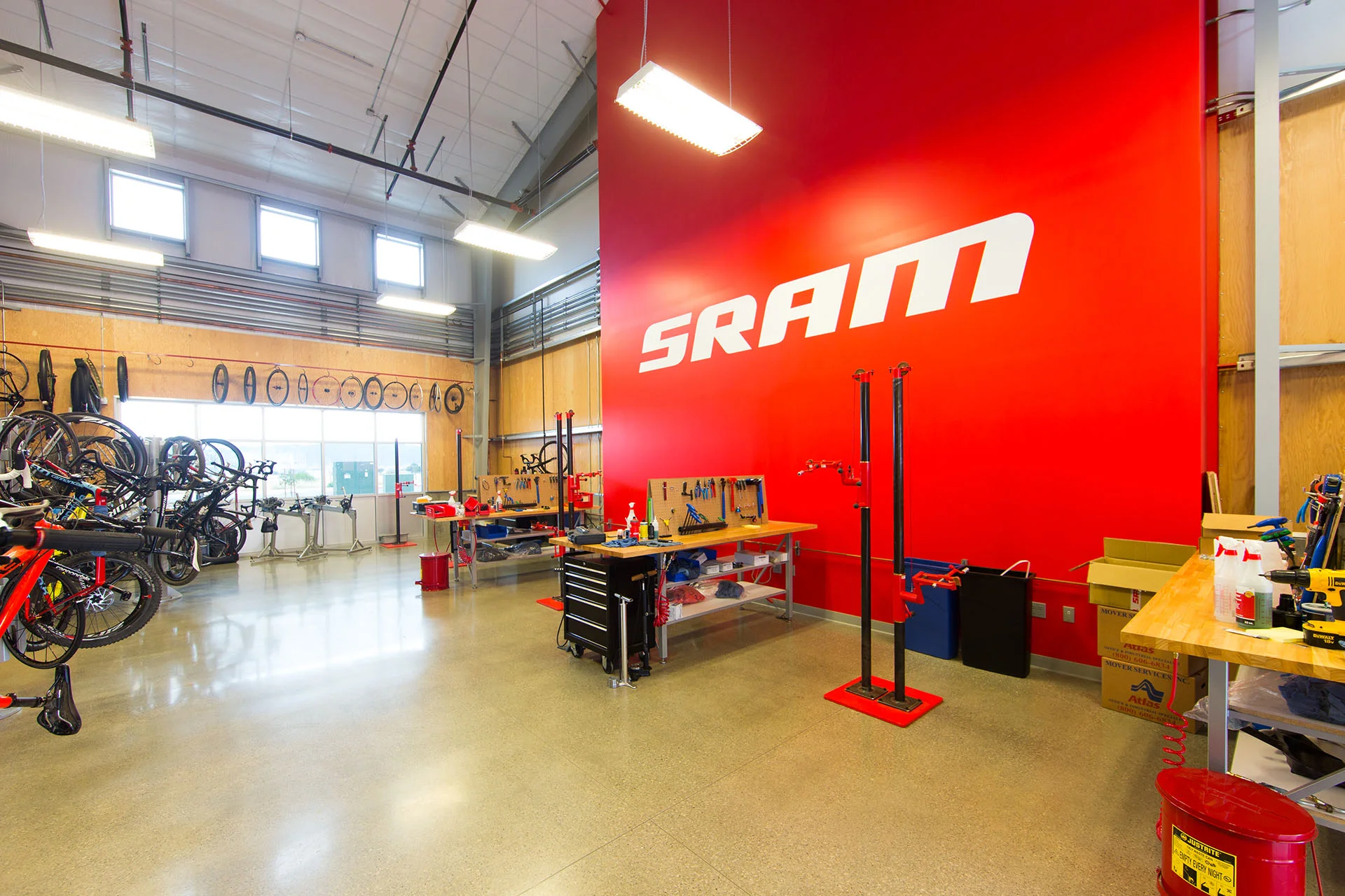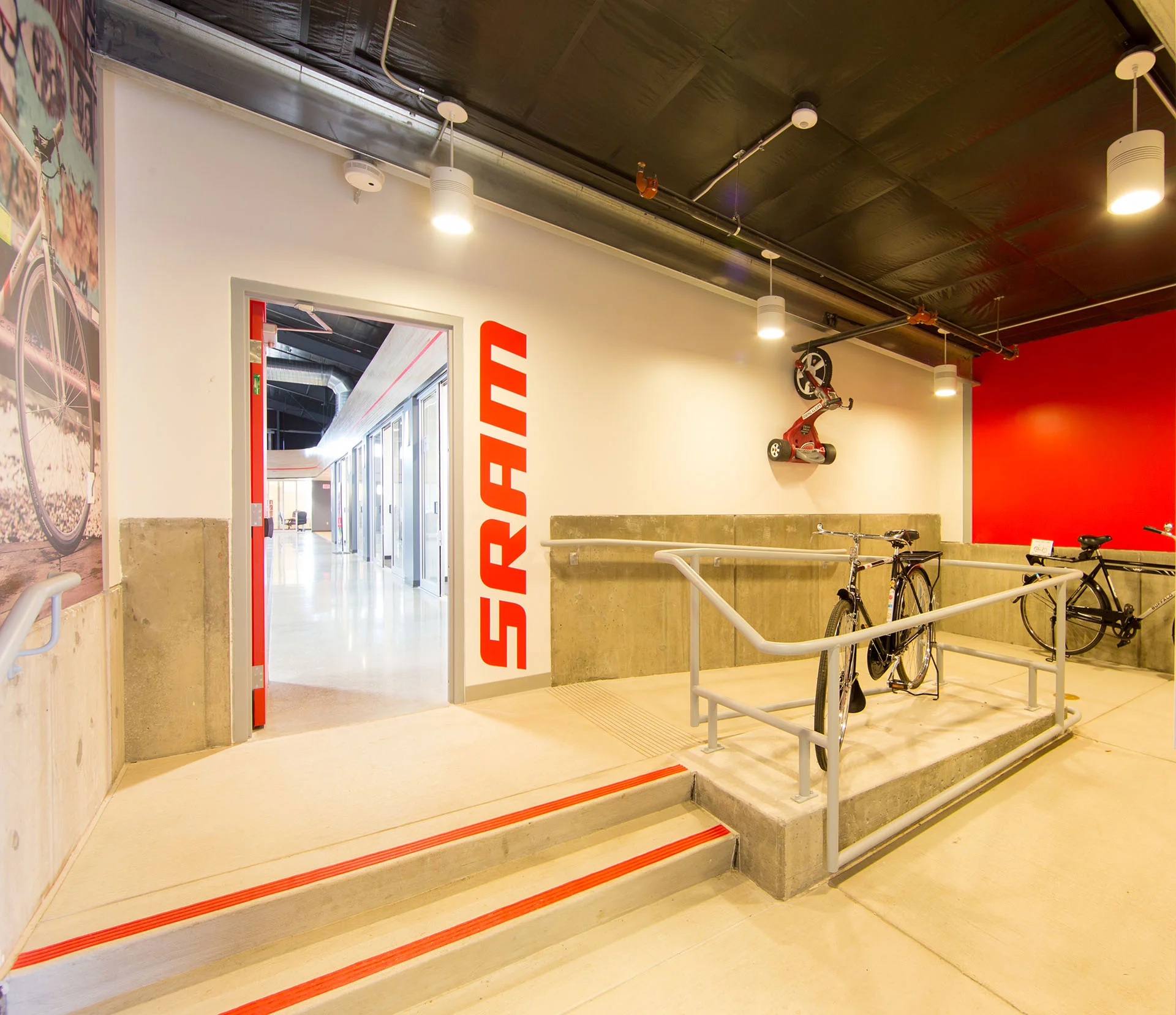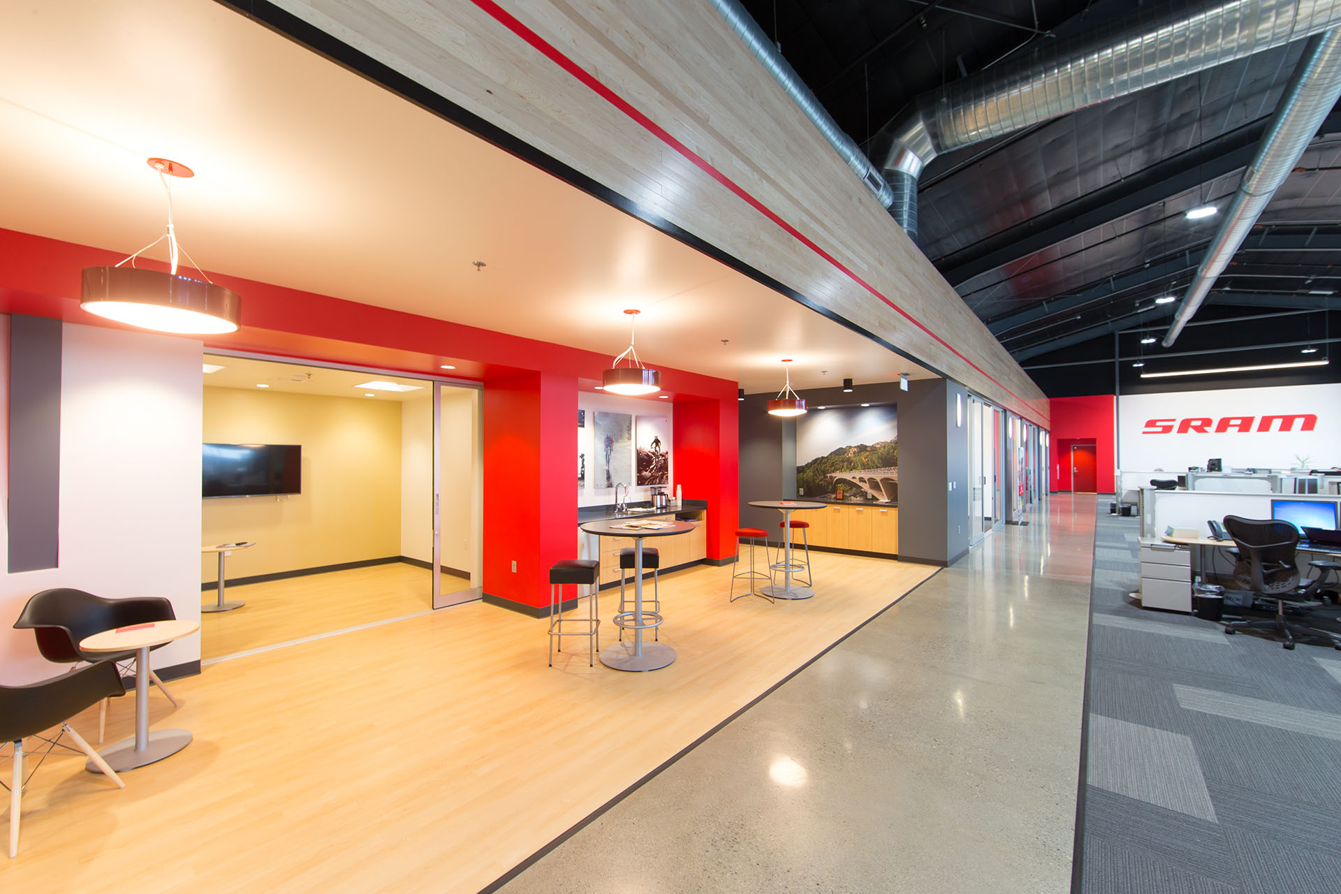 The SRAM Development Center was approximately 20,500 SF of shell building and tenant improvements. The project included open offices, enclosed conference rooms, large meeting rooms, a kitchen and cafe, shop space and testing rooms, gym and locker rooms, and outdoor areas.