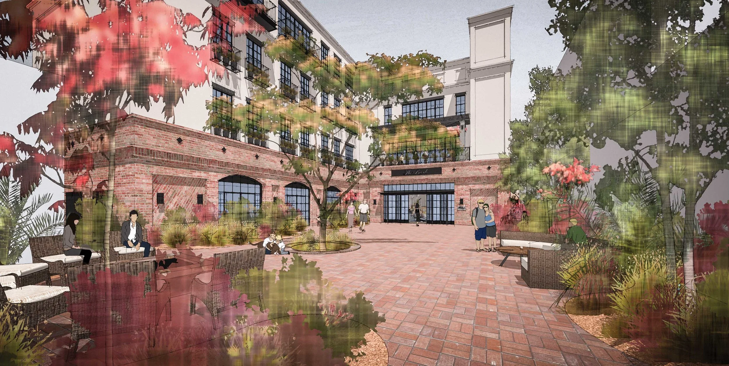 The hotel hosts an expansive rooftop deck with fixed and flexible seating, covered trellis with potted landscaping, and a rooftop bar. The courtyards design highlights planter pockets that develop the feeling of outdoor rooms that become spaces of retreat for visitors and guests.