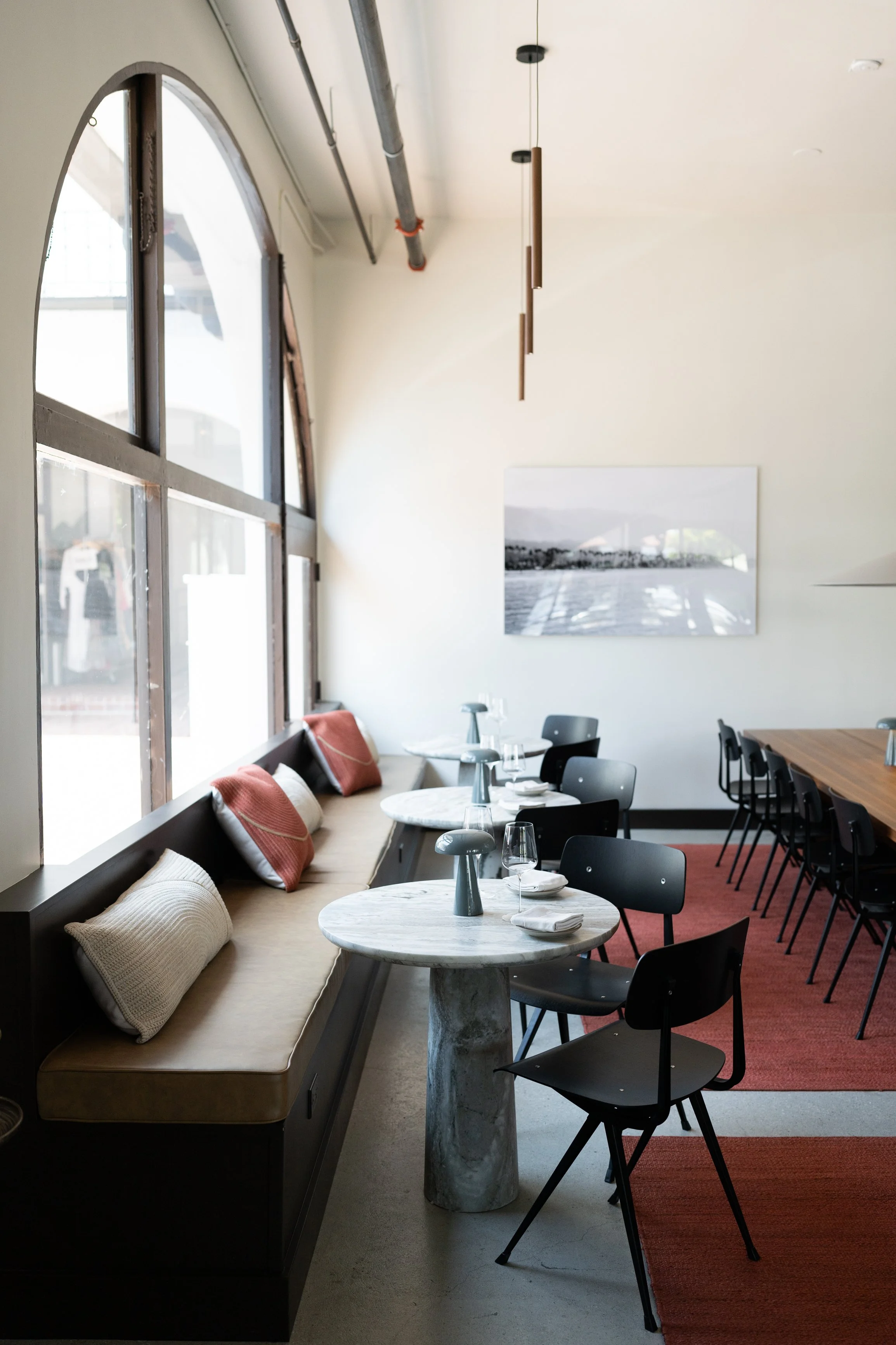 The project inlcuded remodeling an existing restaurant space into a tasting room with an updated commercial kitchen. The program required the development of various experiences within the same space so that guests can choose their level of engeament with the brand. Casual seating areas invite guests to grab a bottle and a quick bite, while more private dining spaces offer an in-depth, cerebral approach to tasting flights, connecting with the winemaker, and the brand’s philosophy.