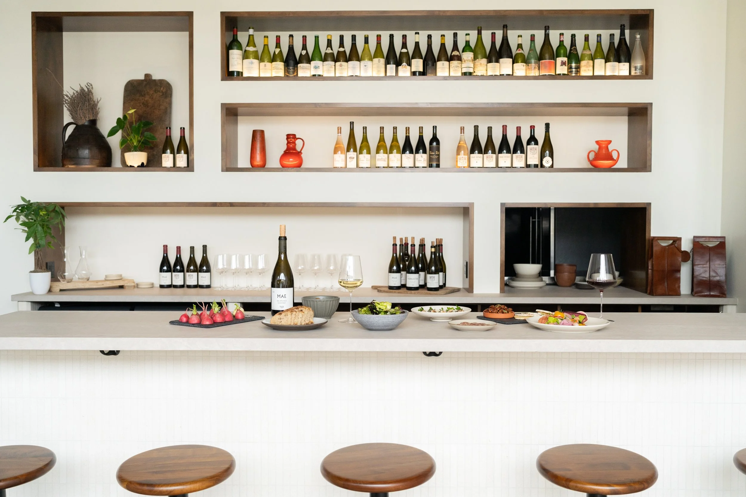 Furnishings, fixtures, and materials were selected by TEN OVER STUDIO in line with the brand’s identity and values. Material selections were inspired by the local terroir, such as the limestone tiles on the bar’s facade, which pay homage to the limestone-rich soil of the Santa Rita Hills, where Tyler & Lieu Dit grapes are lovingly grown.