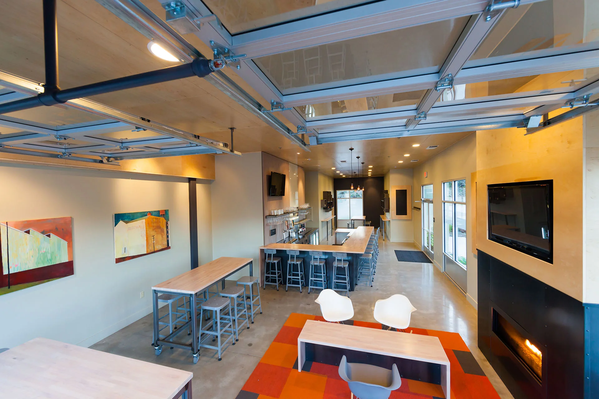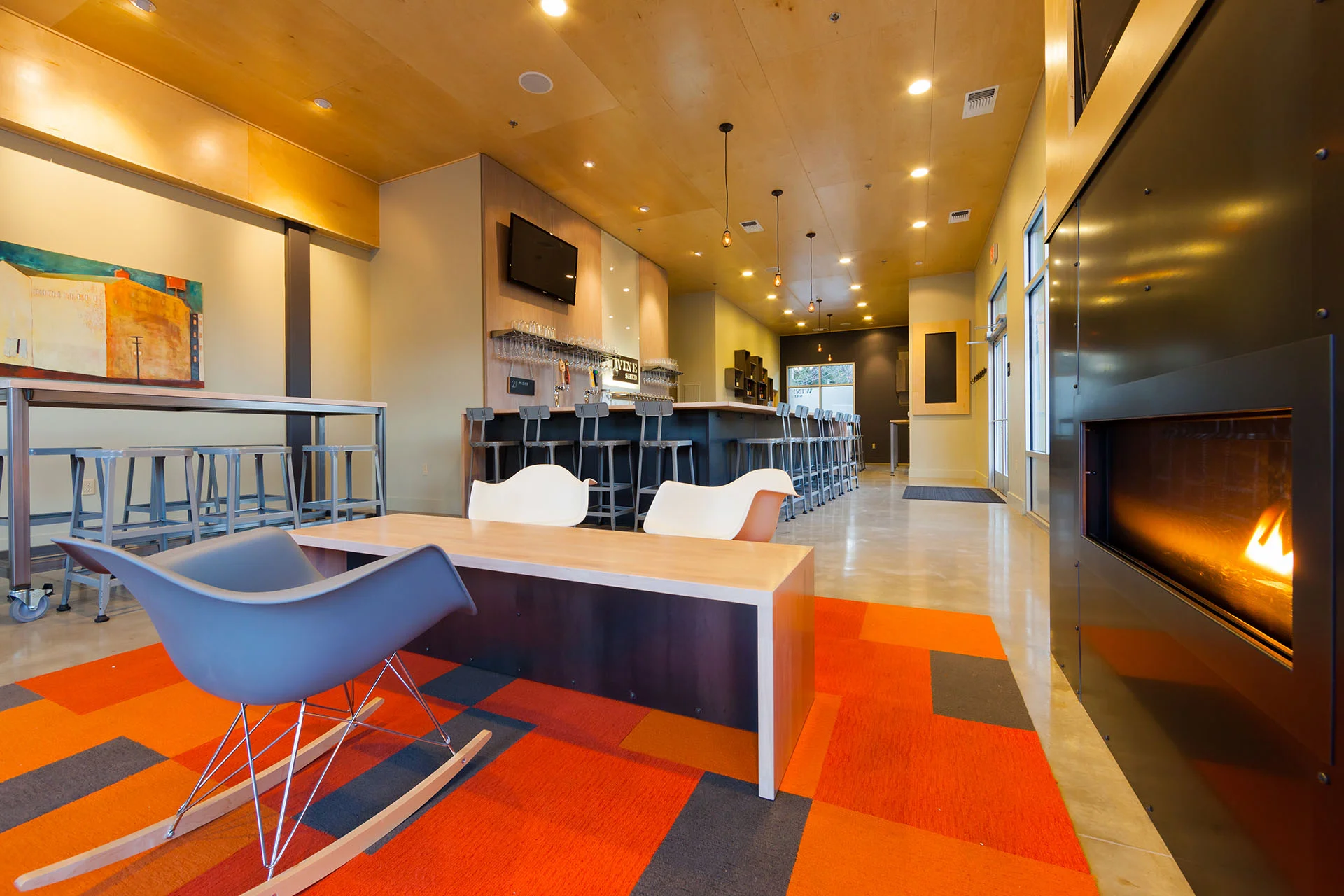 Wine Shed is a hip Central Coast bar specializing in fine wines and tasty craft beers. TEN OVER STUDIO worked closely with the client to create a welcoming destination in this 1,300 SF non-descript shell building, located in an up-and-coming neighborhood. A large roll-up door creates an open-air experience in warmer seasons; a fireplace is cozy and inviting on cool evenings. Décor is colorful and contemporary, with multiple seating areas to accommodate both intimate and larger groups. The bar was one of the first to feature an innovative, cost-effective custom system for pouring wine on tap.